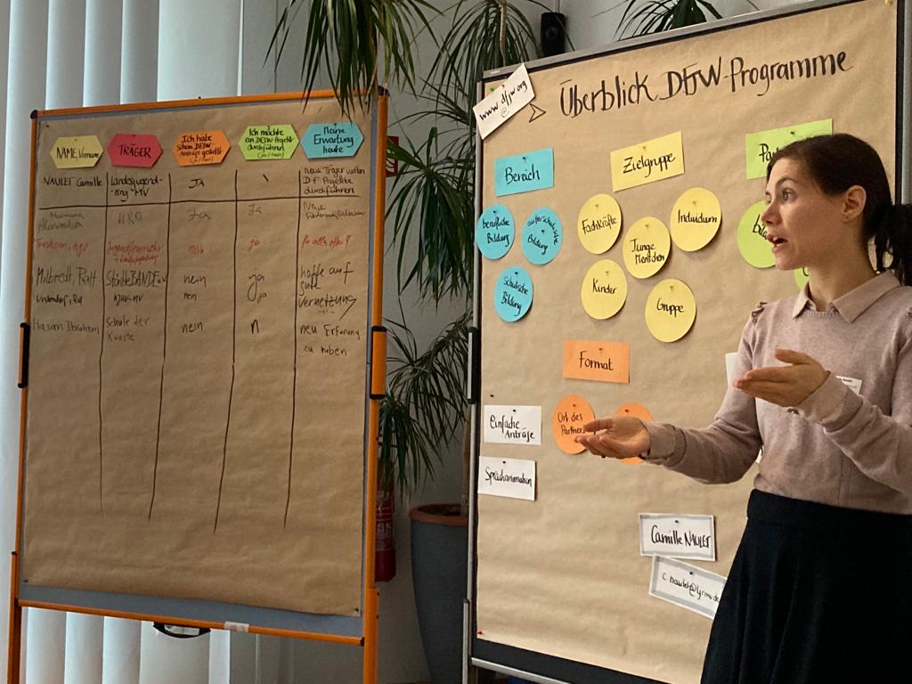 15.01.2024 in Schwerin: Das Programm vom deutsch-französischen Jugendaustauschprojekt wird aktualisiert. Camille Naulet (rechts, Referentin für deutsch-französischen Jugenaustausch) erklärt; Andreas Steglich (links, Gründungsmitglied des StädteBANDE e.V.) hört gespannt zu...